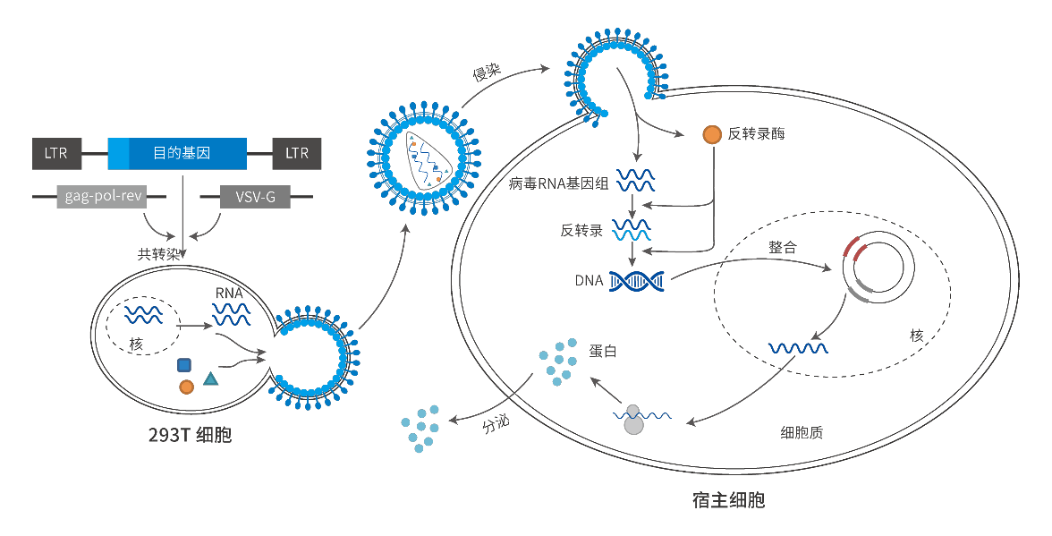 • 慢病毒的感染具有整合特性,能够将外源基因有效地整合到宿主染色体上,达到持久性表达,因而可构建稳定细胞株,用于基因的细胞功能研究。借助慢病毒载体改造T细胞可用于CAR-T细胞治疗。